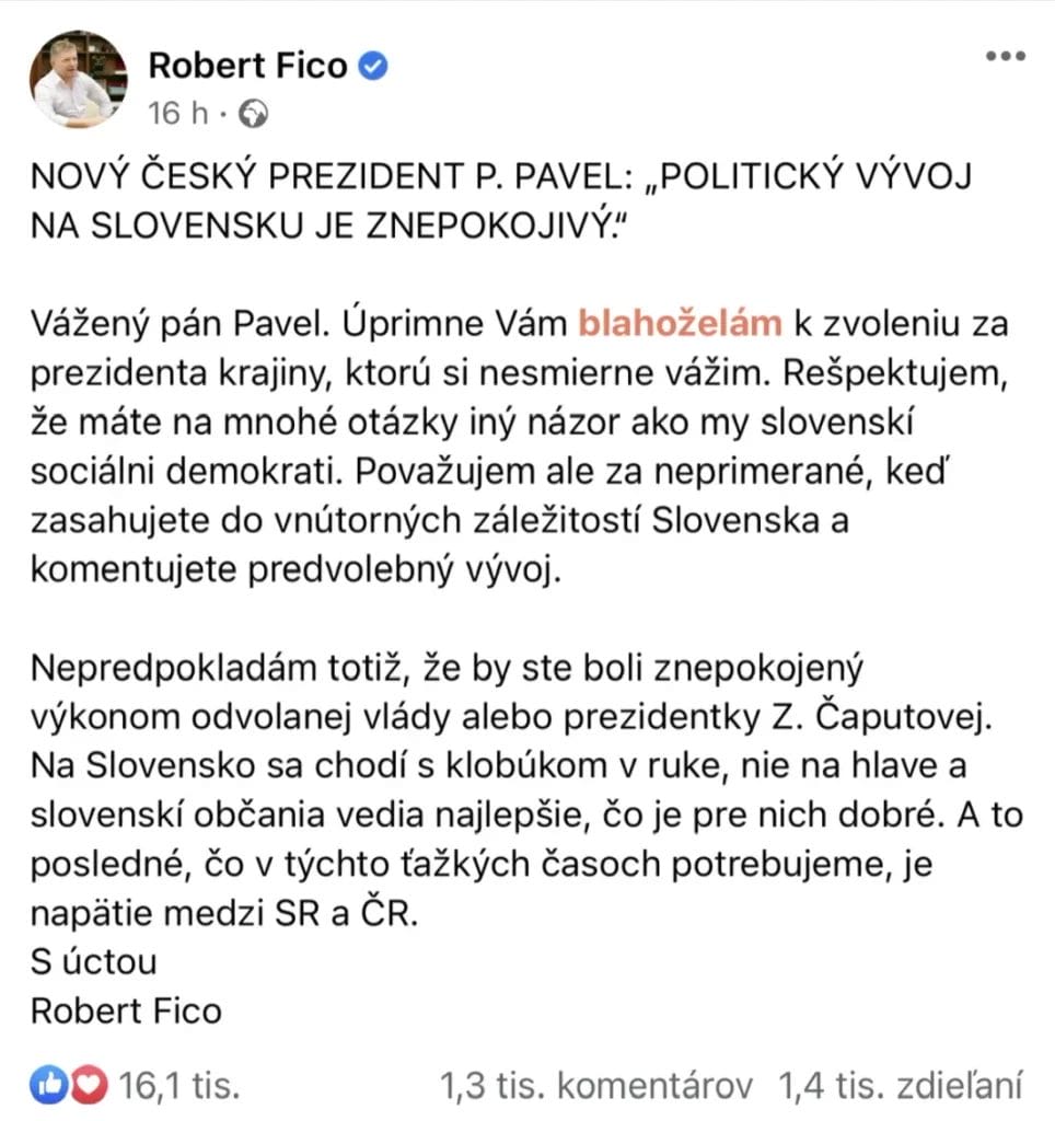 Vážený pán Pavel. Úprimne Vám blahoželám k zvoleniu za prezidenta krajiny, ktorú si nesmierne vážim. Rešpektujem, že máte na mnohé otázky iný názor ako my slovenskí sociálni demokrati. Považujem ale za neprimerané, keď zasahujete do vnútorných záležitostí Slovenska a komentujete predvolebný vývoj.