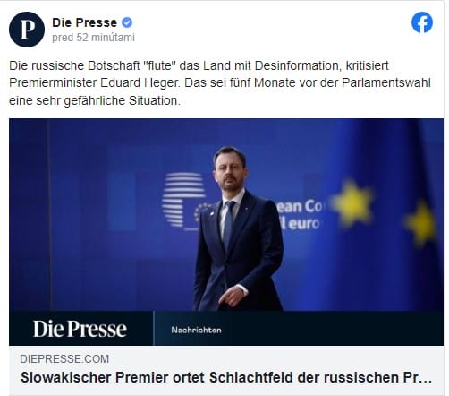 „Máme ruskú propagandu, ktorá je na Slovensku veľmi prítomná,“ povedal Heger v stredu večer na prednáške na Diplomatickej akadémii vo Viedni. Ruské veľvyslanectvo „zaplavuje“ krajinu dezinformáciami, no nielen ich. Posolstvá by preberali aj politici. To je päť mesiacov pred parlamentnými voľbami veľmi nebezpečná situácia.