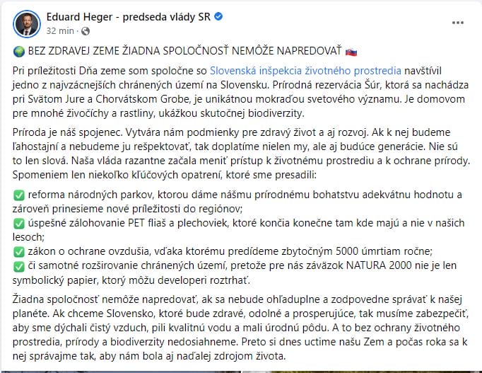 „Príroda je náš spojenec. Vytvára nám podmienky pre zdravý život a aj rozvoj. Ak k nej budeme ľahostajní a nebudeme ju rešpektovať, tak doplatíme nielen my, ale aj budúce generácie. Nie sú to len slová. Naša vláda razantne začala meniť prístup k životnému prostrediu a k ochrane prírody,“ pripomenul Heger vo svojom statuse zo soboty a pridal aj fotografie.