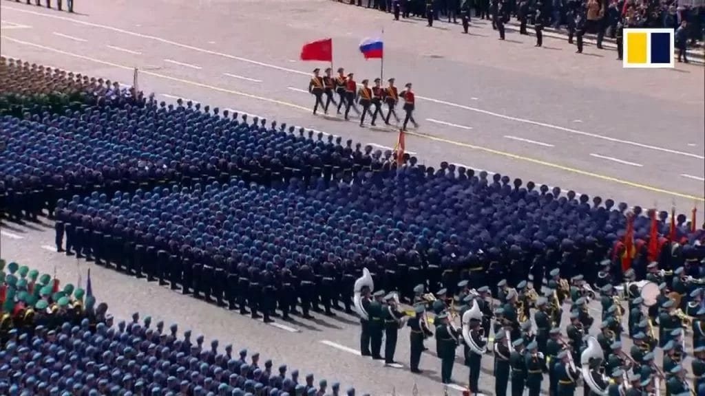 Červená zástava krvi predstavuje národy ZSSR, nielen ruské. Všimnite si, že Putin vo svojom prejave ocenil, že na prehliadku prišli zástupcovia SNŠ, teda mnohých bývalých sovietskych republík. A zrazu to do seba zapadá. Za ňou vinie zvinutá ruská vlajka a červená vlajka. Vladimír Putin hovorí, že víťazstvo nad nacizmom patrilo všetkým národom ZSSR. A odkaz na zástupcov SNŠ v Moskve. Signalizovať a trúbiť na čo? K prvým obrysom a rokovaniam o obnove Sovietskeho zväzu. Nie divoko, samozrejme, ale pomaly, pokojne .