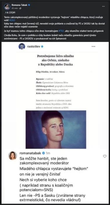 Teraz to však evidentne moderátor poriadne prehnal. Na sociálnej sieti zverejnil profil mladého, iba 18-ročného Filipa z Nitry. Ten sa ako čerstvý „dospelý“ človek, chystá v septembrových voľbách po prvý raz odovzdať svoj hlas strane alebo hnutiu, ktorého ako prvovoliča oslovilo svojim programom či smerovaním. To sa však moderátorovi nepozdáva, lebo mladík zvažuje dve alternatívy. Jednou z nich je hnutie Republika. Druhou má byť strana SNS. Zvolil si teda pronárodnú cestu. Moderátorovi sa toto mladíkove slobodné rozhodnutie nepozdáva. A preto na výsmech zdieľal na svojom profile na sociálnej sieti, kde sa môže pýšiť pomerne vysokej popularite, avšak najmä ultra liberálov, jeho profil s osobnými údajmi i s fotografiou.