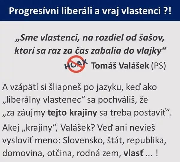 A vzápätí si šliapneš po jazyku, keď ako „liberálny vlastenec“ sa pochváliš, že „za záujmy tejto krajiny sa treba postaviť“. Akej krajiny, Valášek? Veď ani nevieš vysloviť meno: Slovensko, štát, republika, domovina, otčina, rodná zem, vlasť… !,“ odpovedá Rafaj na toto vyjadrenie progresívneho politika.
