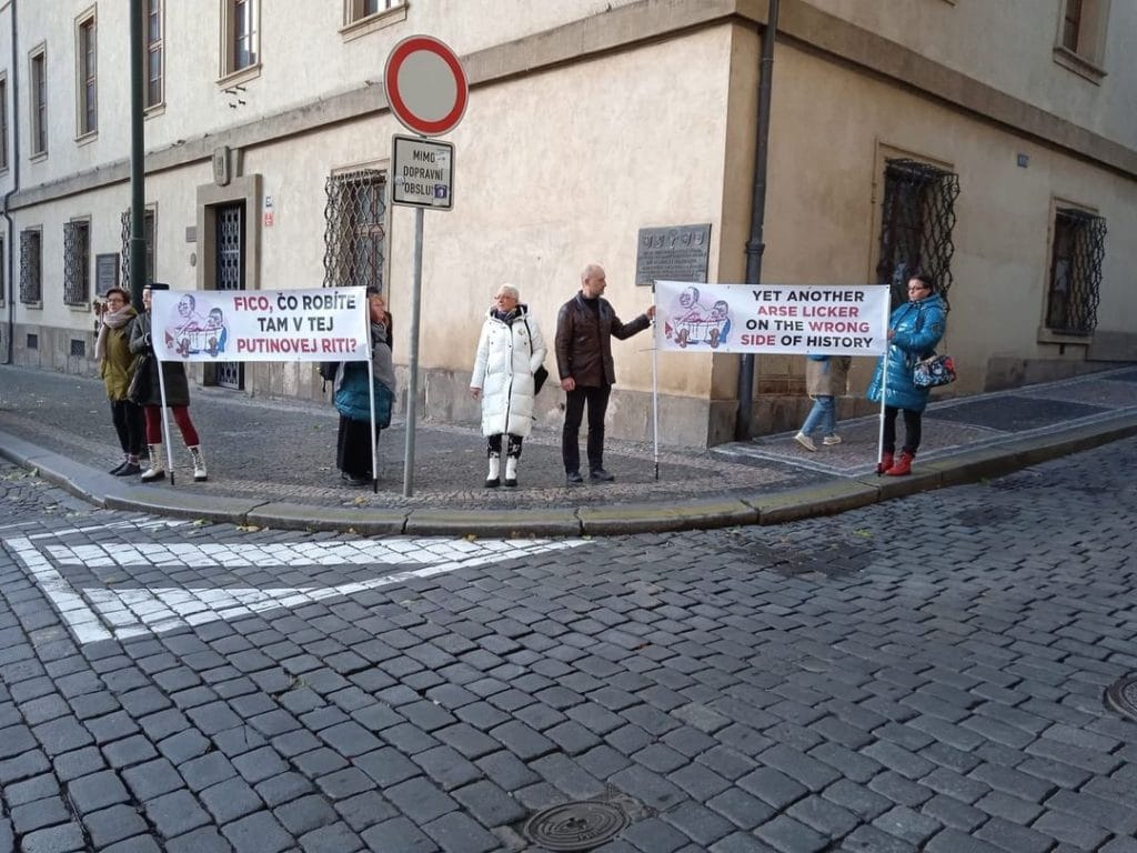 Včera bol Fico na návšteve Prahy a tak slniečkári zorganizovali protest. Ako je z fotografie vidieť, pre masovú účasť musela v Prahe kolabovať doprava, námestie sa otriasalo v základoch a pre obrovský nápor nebolo niektorým účastníkom vôbec dovolené vyjsť na ulicu, o čom svedčia mreže na oknách. Ale jedno mi nejde do hlavy. Fico bol v Prahe, ale oni píšu, že je v Putinovej riti. To si takto ctení demonštranti vážia svoje hlavné mesto?