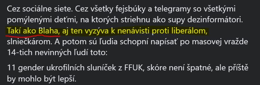 „To, čo sa stalo v Prahe, je desivé. Ako samostatný čin, ale najmä v kontexte všetkých podobných masakrov, v ktorých vraždia deti ledva odrastené z dupačiek. Je toho stále viac. Po pandémii Covidu nás zasiahla pandémia porúch duše. Kým sa nestrieľa, nevenujeme tomu pozornosť. Ale niečo sa deje. A to niečo sa šíri ako vírus. Cez sociálne siete. Cez všetky fejsbúky a telegramy so všetkými pomýlenými deťmi, na ktorých striehnu ako supy dezinformátori. Takí ako Blaha, aj ten vyzýva k nenávisti proti liberálom, slniečkárom.