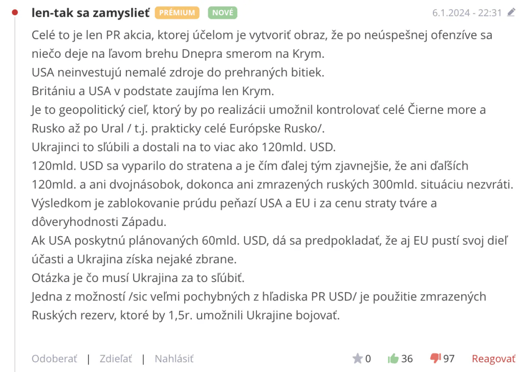 A teraz vážne. V roku 2024 sa budú výrazne meniť aj nálady v médiách bývalého hlavného prúdu. Toto je z toho istého článku. Pozrite si počet lajkov. Ono to s tými „prebudenými“ nebude nakoniec v roku 2024 až také zlé. Tak ako Rusko možno poraziť iba zvnútra, žlté médiá porazia ich vlastní čitatelia. A niektorých z toho možno porazí aj naozaj. Ale tak to už chodí. Život je zmena… A z ich popola vyrastie niečo nové, niečo čo bude odrážať požiadavky nového, lepšieho človeka.