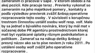 Zurian napísal: „V súvislosti s korupčnou trestnou činnosťou ustáliť osobu Wolf, resp. Volf. Malo by sa jednať o bývalého novinára, ktorý má v súčasnej dobe PR agentúru, prostredníctvom ktorej mali byť vyplácané úplatky rôznym podnikateľom a politikom. Zamerať sa na nákup Detiky (presný názov, ako sa to píše, neviem) v roku 2011. Po ustálení osoby Wolf zvážiť jej operatívne rozpracovanie.“
