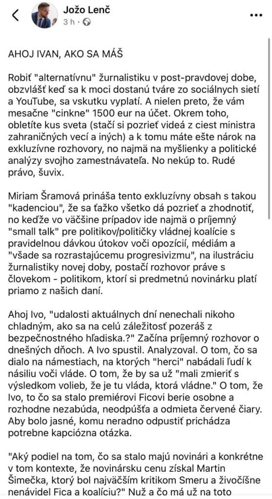 One tajm v relácii u Mimi, next time na FB proti Mimi „Nezávislý politológ“ Jozef Lenč s viralitou 9 tisíc videní, ktorému na univerzite v Trnave asi málo platia, sa rozhodol prispieť k spoločenskému zmieru v nedeľu ráno namiesto rannej kávičky hejtom voči mojej osobe.