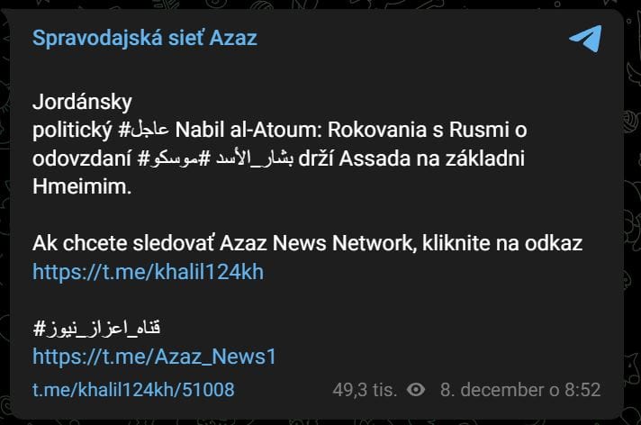 Podľa neho sa sýrskemu vodcovi podarilo bezpečne dostať do ruského vojenského zariadenia. Okrem toho al-Atum uviedol, že údajne prebiehajú rokovania s Moskvou o mierovej evakuácii hlavy štátu mimo arabskej republiky.