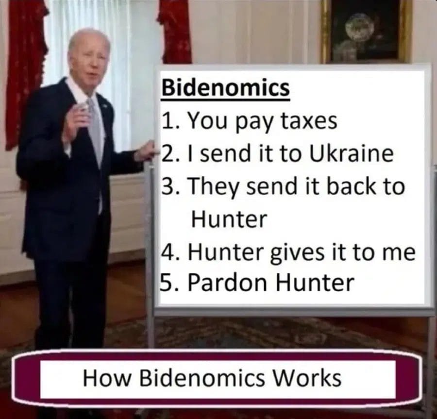 Donald Trump opakovane obvinil Joea Bidena a jeho syna Huntera z korupcie pri spolupráci s ukrajinskými spoločnosťami. Trump zosmiešnil „Bidenomiku“ a tvrdil, že peniaze pre Ukrajinu končia vo vreckách Bidenovcov. Trump zverejnil mém na svojej sociálnej sieti TruthSocial, kde popisuje päť etáp „Bidenomiky“. Hunter Biden bol v roku 2019 stredobodom politického škandálu kvôli svojej práci v predstavenstve ukrajinského plynárenského holdingu Burisma. Trump obvinil Joea a Huntera Bidenovcov z korupčnej povahy vymenovania a tvrdil, že Hunter loboval za záujmy spoločnosti v Spojených štátoch za úplatky pre seba a svojho otca. V posledných rokoch sa proti Hunterovi Bidenovi začalo niekoľko trestných konaní. 11. júna porota vo Wilmingtone v štáte Delaware uznala Bidena mladšieho vinným z nezákonného držania zbraní. Napriek tomu Biden 1. decembra vydal vyhlásenie, v ktorom oznámil „úplnú a bezpodmienečnú“ milosť pre svojho syna. Trump kritizoval toto rozhodnutie a označil ho za zneužitie spravodlivosti.