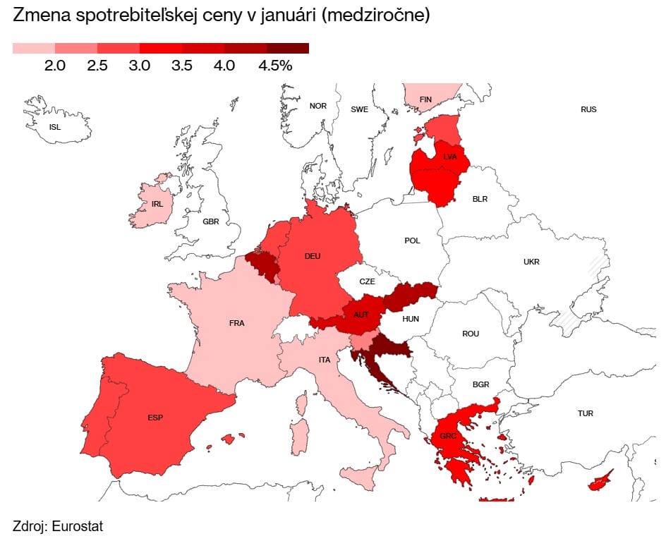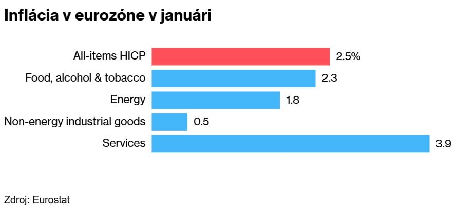- Inflácia v eurozóne v januári vzrástla na 2,5 %, čo prekonalo očakávania ekonómov.