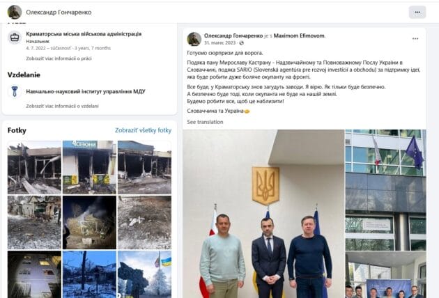 Na prvej fotke je odfotený v strede ukrajinský veľvyslanec na Slovensku Myroslav Kastran, po jeho ľavici stojí primátor mesta Kramatorsk Olexander Honcharenko a po pravici veľvyslanca stojí poslanec a miliardár Maksym Yefimov. Honcharenko a Yefimov figurujú aj na fotke číslo 2 – v strede. Je zaujímavé, že fotky na svojom FB profile zverejnil len Honcharenko, na FB ukrajinského veľvyslanca alebo Maksyma Yefimova by ste ich hľadali márne.Fotka pochádza z verejného FB profilu Oleksandra HoncharenkaFotka pochádza z verejného FB profilu Oleksandra Honcharenka
