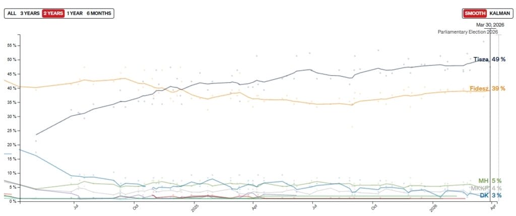 Podľa analýzy, ktorú zostavil denník Politico , v súčasnosti strana Magyars Tisza vedie nad stranou Fidesz o 49 bodov ku 39. Jednotlivé prieskumy verejnej mienky sa však značne líšia v závislosti od politickej orientácie a financovania prieskumných inštitútov.