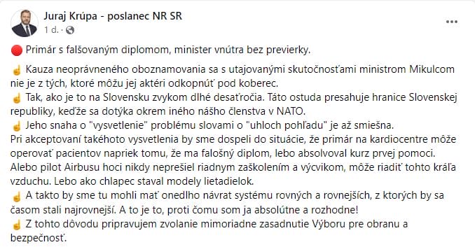Krúpa sa aj na svojej sociálne sieti tvrdo do Mikulca obul. Ministra vnútra v ňom prirovnal k primárovi s falošným diplomom. Tvrdí, že Mikulcov pokus o vysvetlenie kauzy manipulácie s utajovanými skutočnosťami, je smiešny.