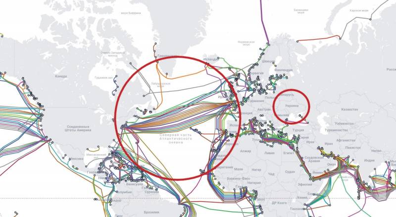 V červených kružnicích jsou místa vedení optických kabelů, které mají být vyřazeny ruskými podvodními jadernými údery, buď v souvislosti válkou na Ukrajině, nebo zřejmě i v souvislosti se zabráněním budoucího možného náletu stovek jaderných bombardérů F-35 z Finska, Polska, Česka a Německa a dalších zemí NATO!